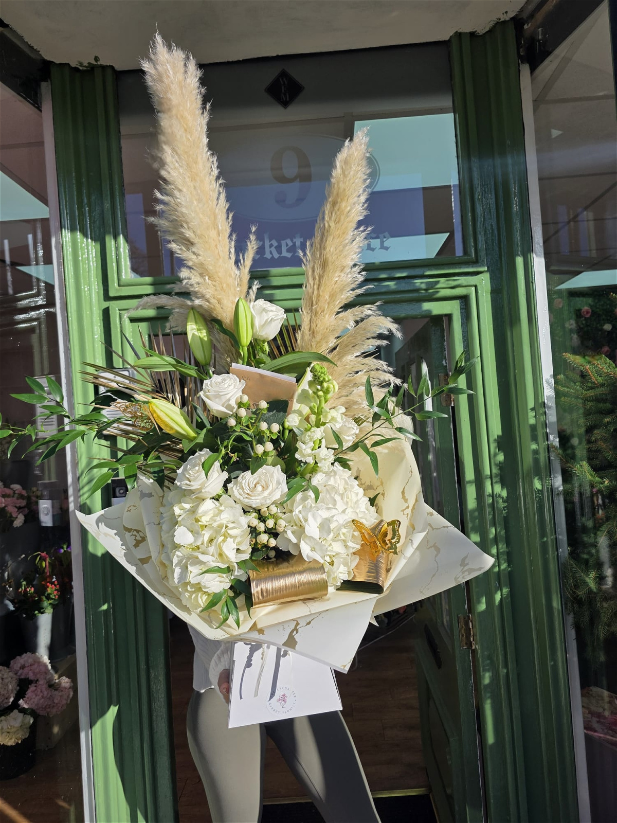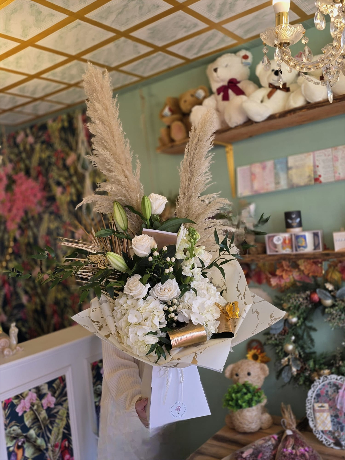 White Roses, Hydrangeas, Hypericum, Pampas, Festive Foliages... what more do you want for a neutral lover this Christmas?
