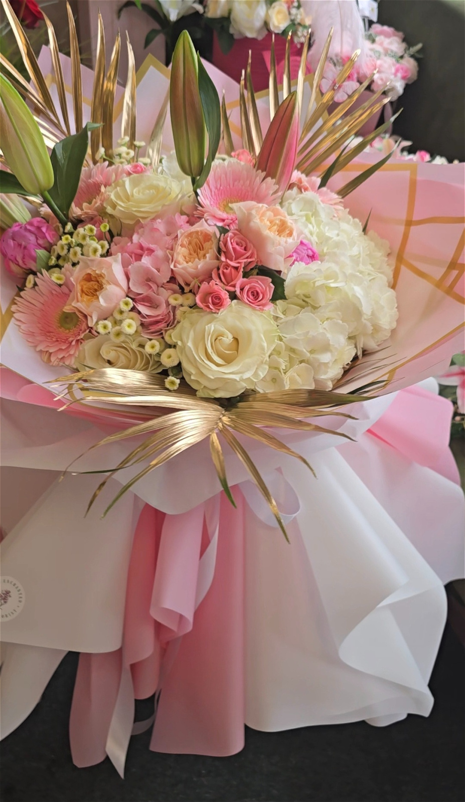 Selection of similar in season flowers and colours as in the photographs. Peonies are not yet in season