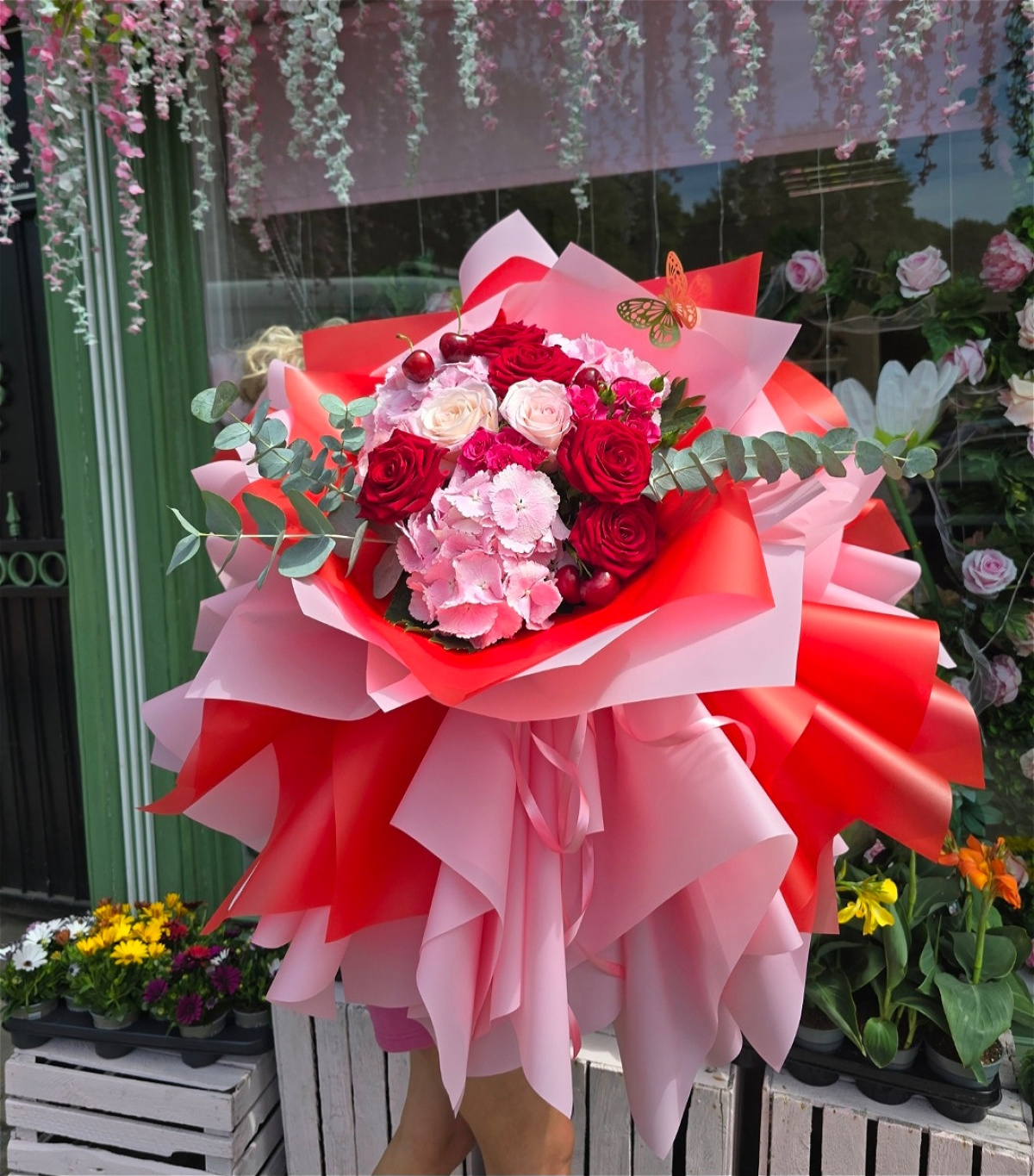 A mix of Pink, Red and White flowers including Red Roses.