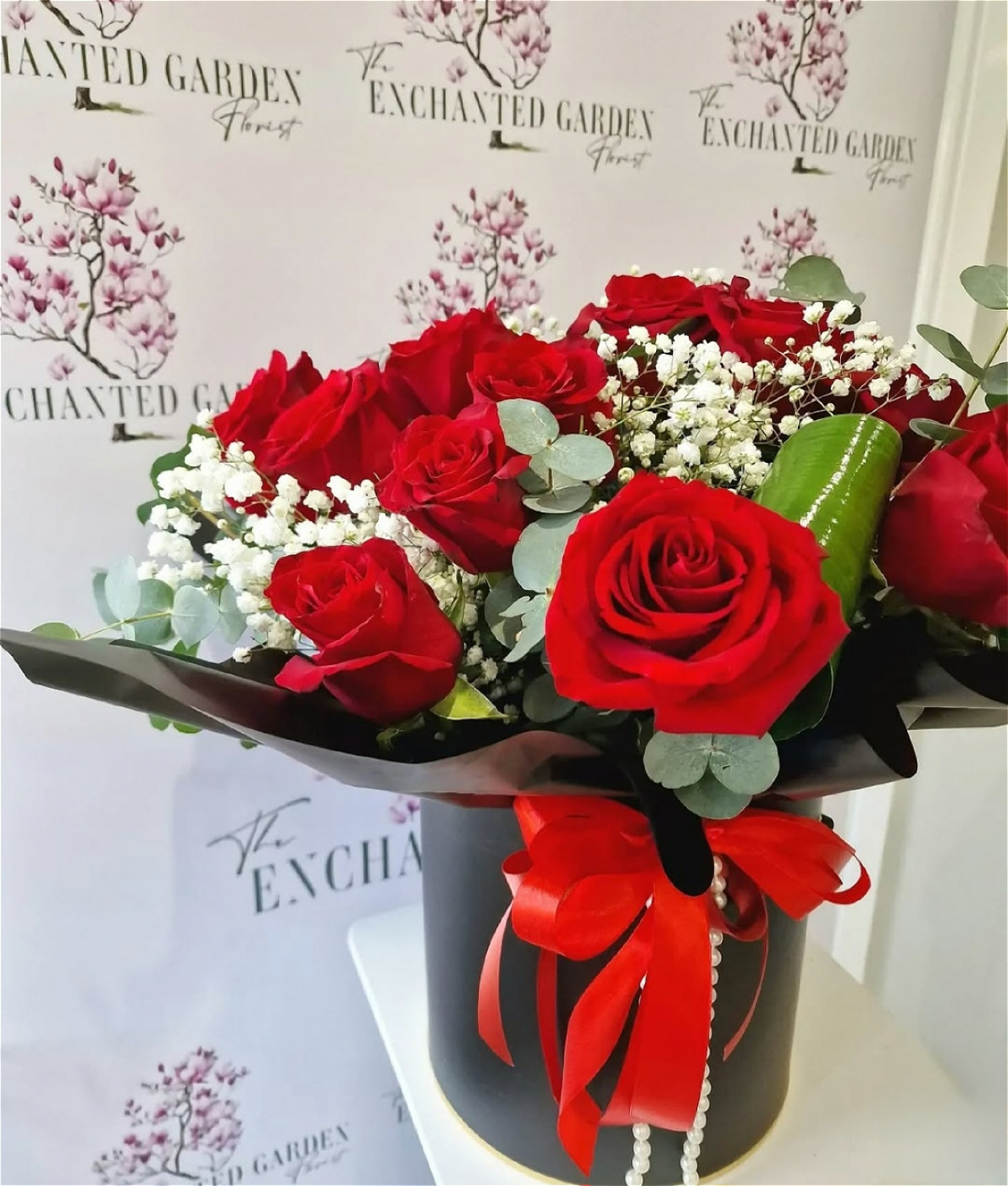 Stunningly decorated black hat box arrangement, containing outstanding Red Roses, White Gyp, White Hydrangeas and Eucalyptus and other complimenting foliage.